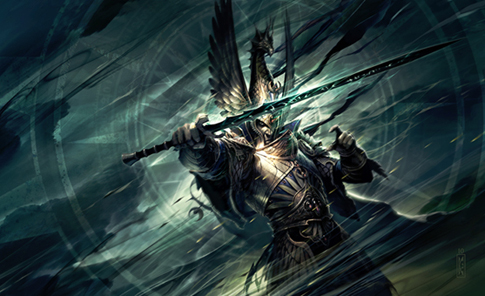 Notice that the helmet bears a slightly different design than that seen on the Vanari Auralan Wardens, and the Aelf in question appears to be holding a weapon which bears a striking resemblance to our image.